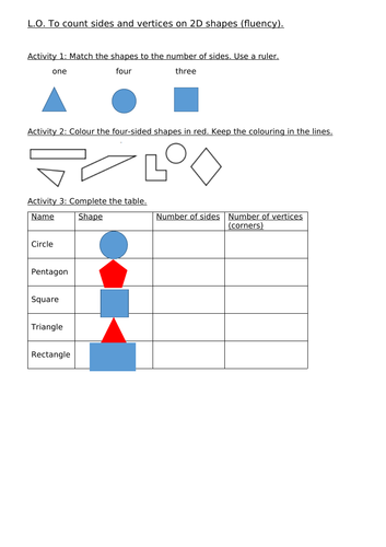 2 DSides and vertices worksheet ID: 2384764 Language: English School subject: Math Grade/level: 3 Age: 8-9 Main content: 2d shapes Other contents: vocabulary Add to my workbooks (2) Download file pdf Embed in my website or blog Add to Google Classroom